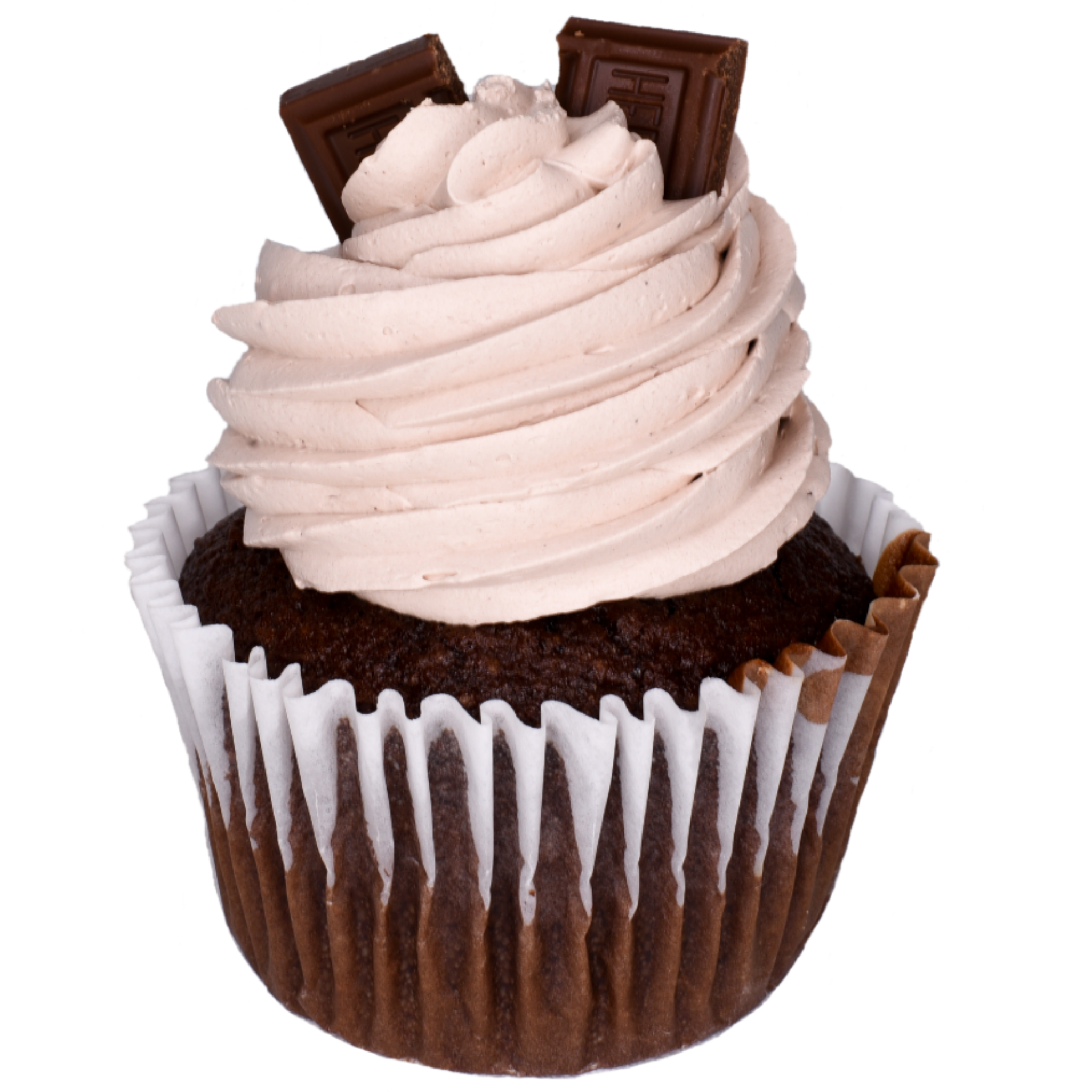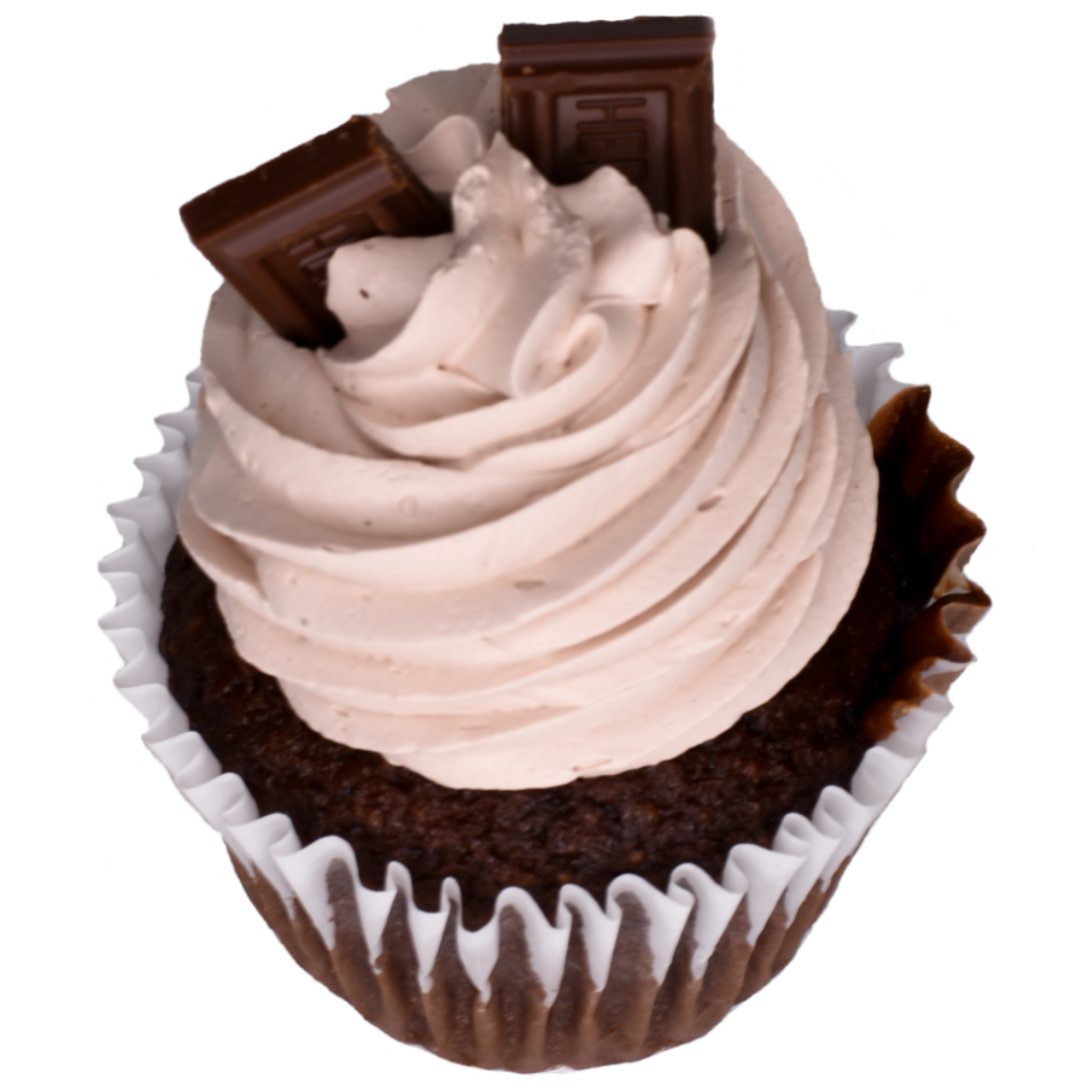 Chocolate cupcake frosted with chocolate mousse and topped with two chocolate Hersey candies.