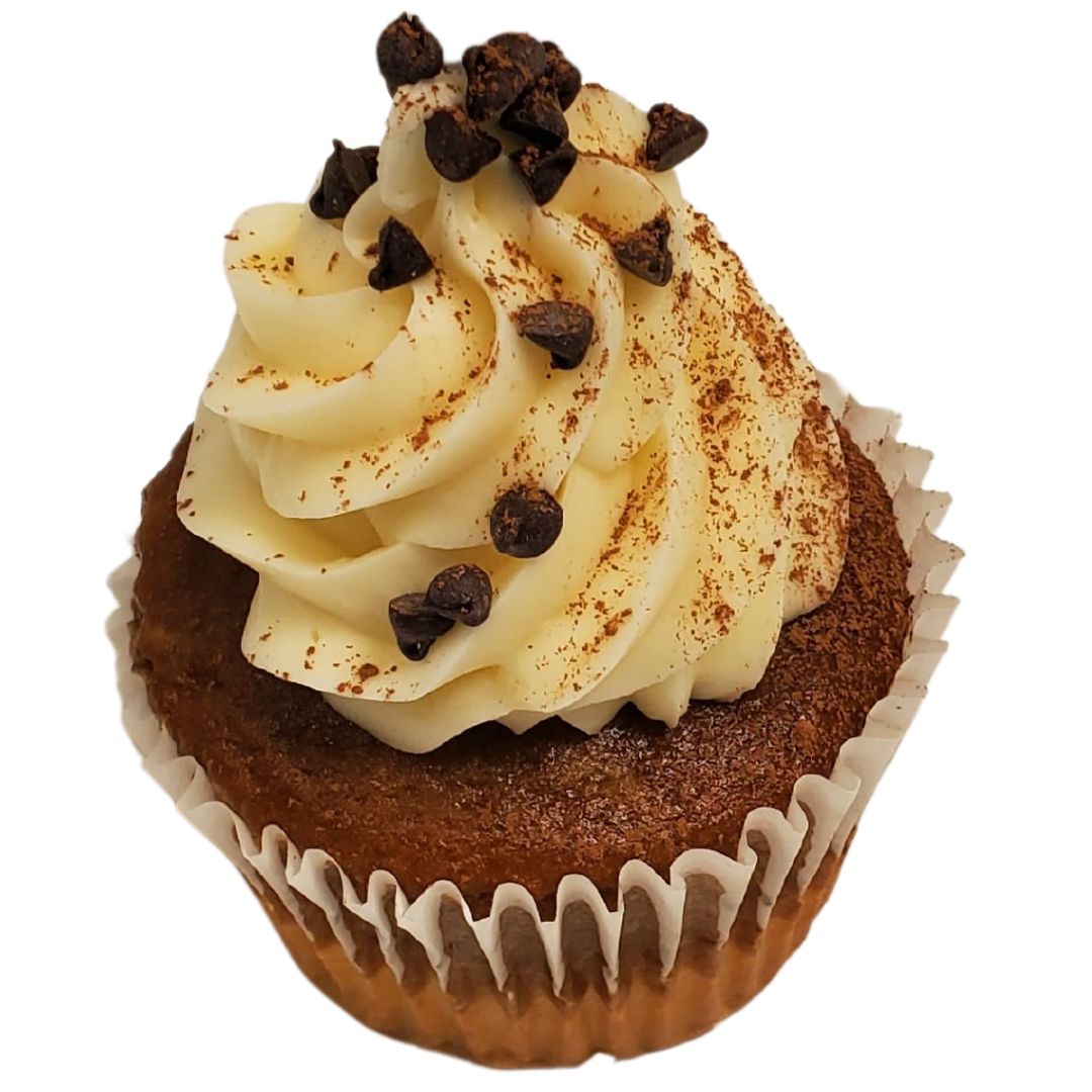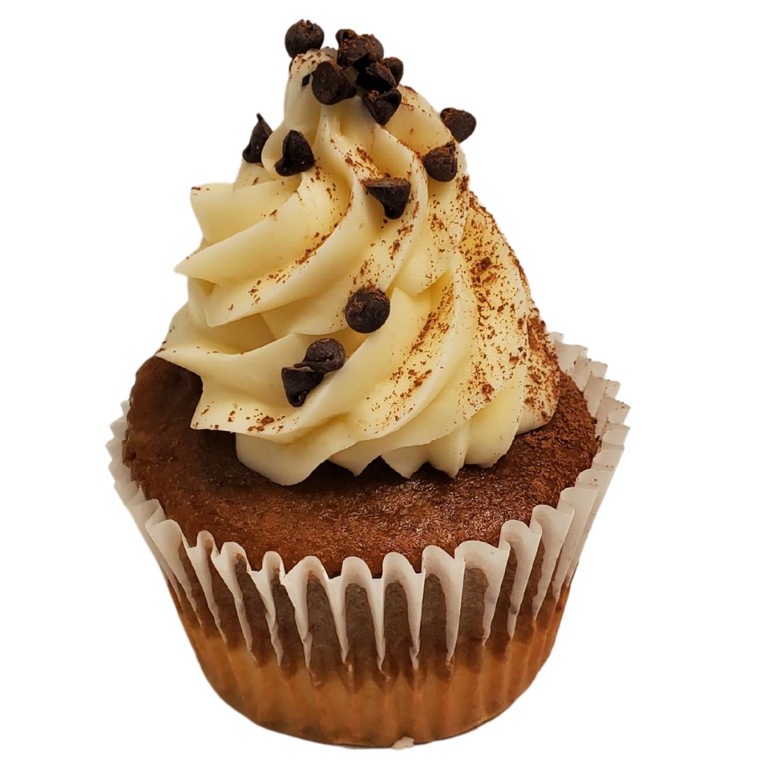 Tiramisu cupcake filled with a coffee flavor cream filling, topped with cream cheese and sprinkled with chocolate chips and cocoa powder.